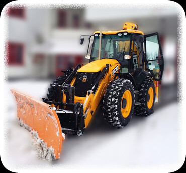 Производим чистку снега с помощью экскаватора-погрузчика JCB 3CX, 4CX Super с боковым отвалом.